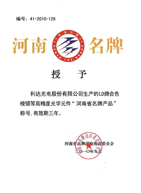 利達(dá)光電“LD”牌高精度光學(xué)元件榮獲河南省名牌產(chǎn)品