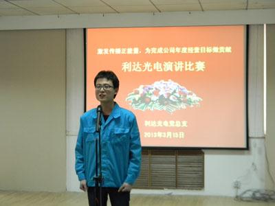 ??????? 為深入學習貫徹利達公司2013年經營工作會議精神,進一步明確發展目標,統一全員思想,激發傳播正能量,推動公司自我變革活動,在春暖花開、充滿希望的季節,利達光電黨總支舉辦“激發傳播正能量,為完成公司2013年經營目標做貢獻”演講比賽活動。